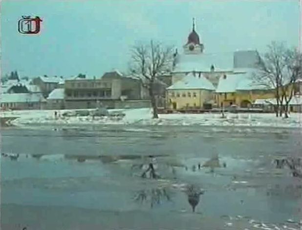 Pohled přes Vltavu na centrum Týna n. Vlt. Vpravo je opravený kostel, vpředu vyrostl penzion U Voraře (při povodních 2002 skoro celý pod vodou). Vlevo je hotel Zlatá loď, v jeho restauraci (okna směrem k řece) se natáčela jedna scéna z tohoto filmu.