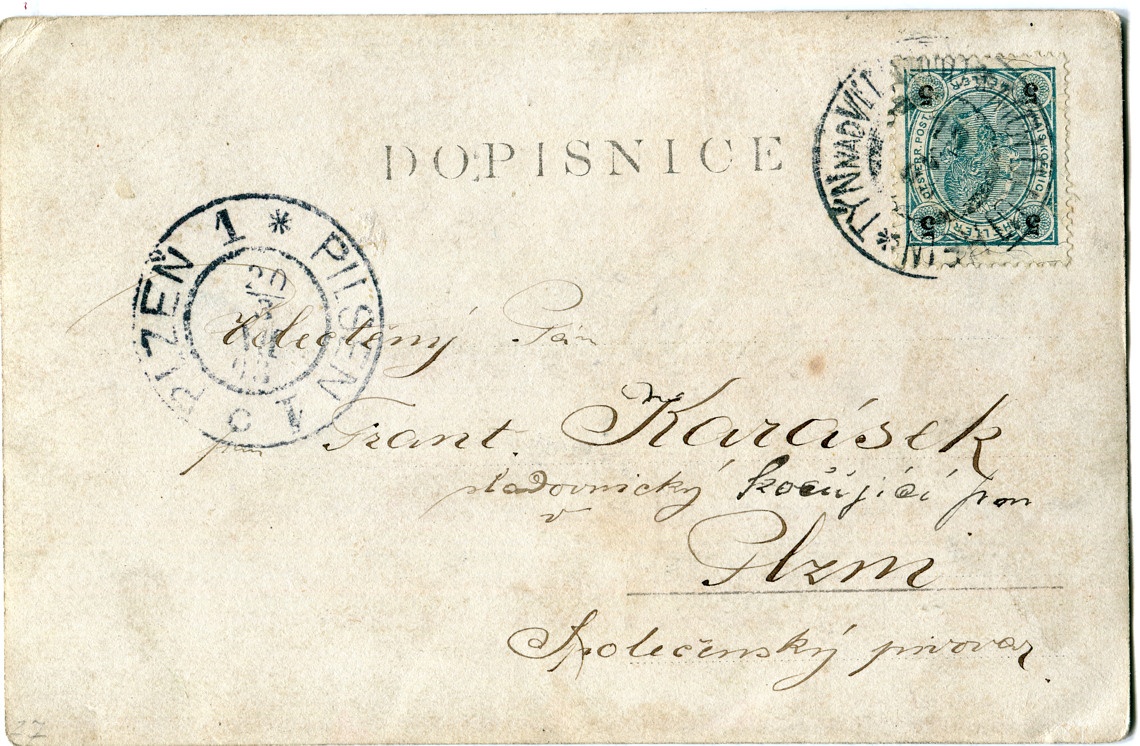 Pozdrav pro velectěného pána Karáska, sladovnického kočujícího.. Dopis byl odeslán z Týna nad Vltavou, nicméně na fotografii je s největší pravděpodobností zachycen pivovar jiný. Týnskému i tomuto je velmi podobný pivovar Drhovle (za Pískem), ale pravděpodobně to není ani ten.