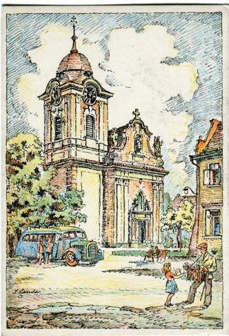 Hlavní nádraží u kašny, řeka ještě bez Nového mostu. Městečko Týn nad Vltavou.