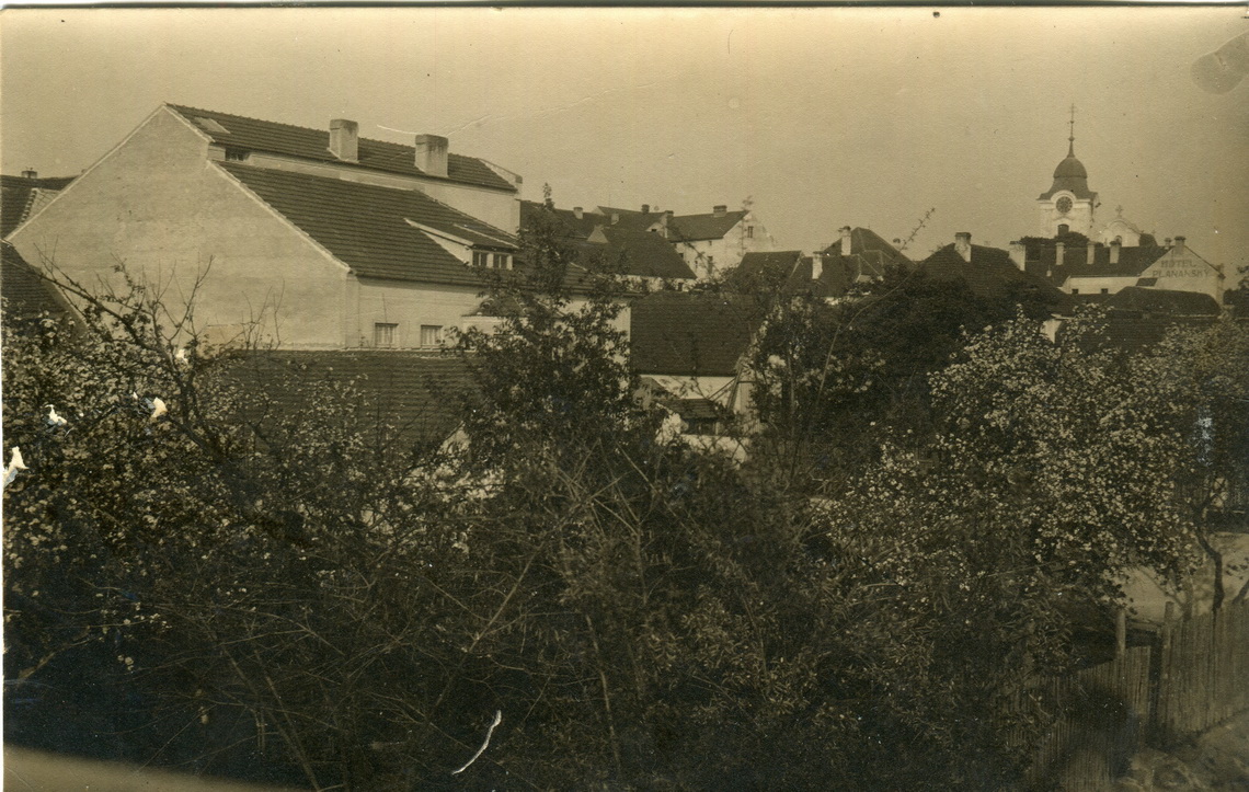 Pohled z okna domu č.p. 84 východním směrem do zahrady, tj. směrem na hrad (dnes přes Táborskou ulici).